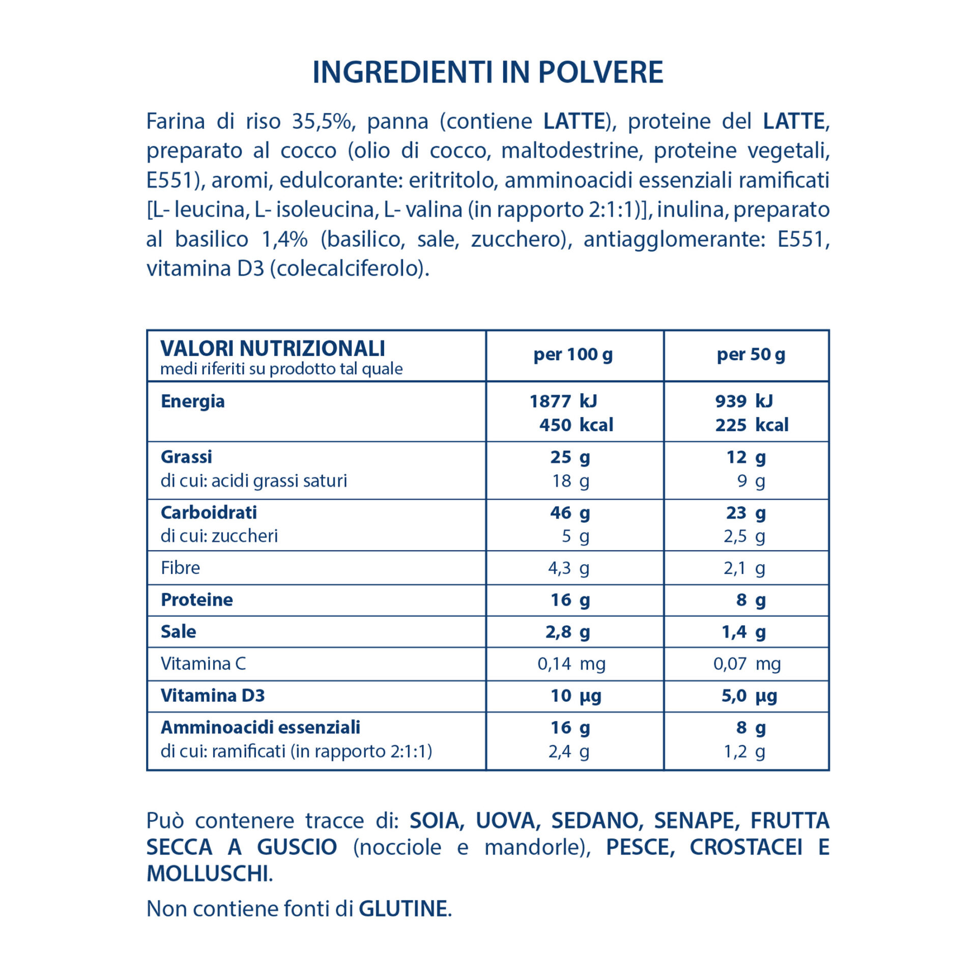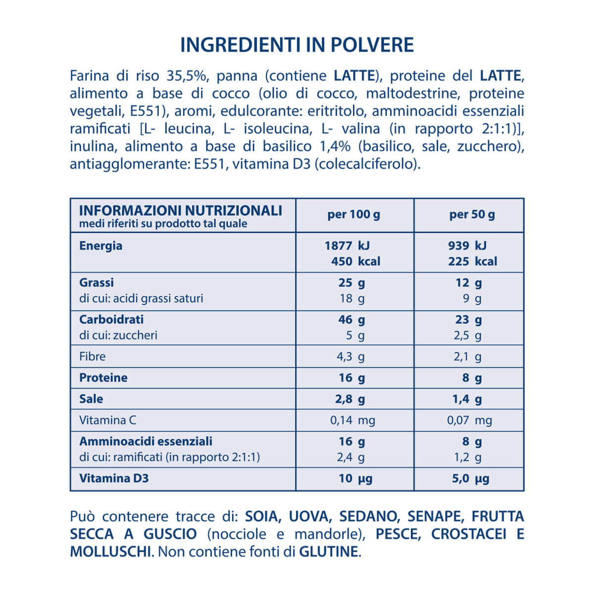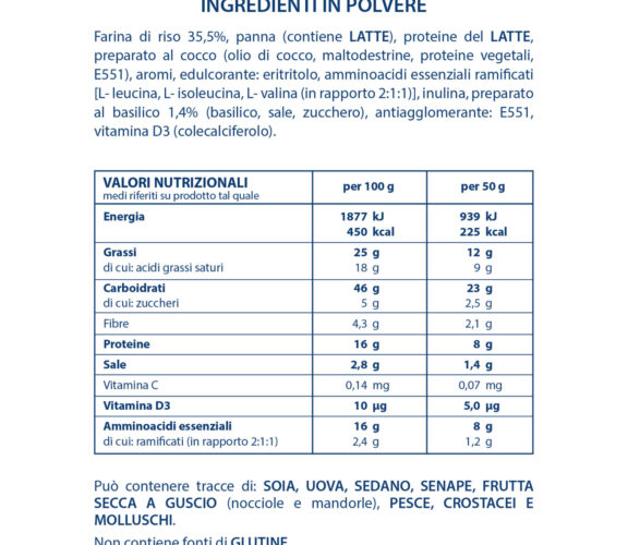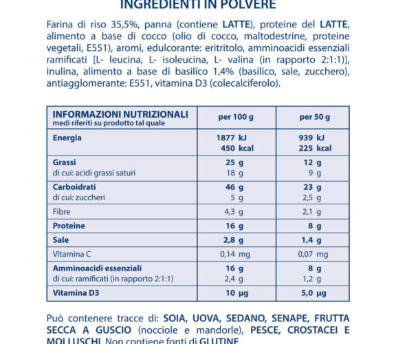 | Allergeni | Crostacei e Molluschi, Frutta secca, Pesce, Sedano, Senape, Soia, Uova |