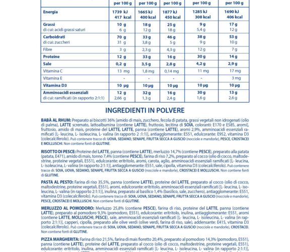 Alimento a base di biscotti 36% [amido di mais, zucchero, fecola di patata, grassi vegetali non idrogenati (olio di palma), LATTE scremato, lattoalbumina (contiene LATTE), fruttosio, lecitina di SOIA, coloranti: E170 e E585, aromi], fruttosio, amido di mais, proteine del LATTE, LATTE, panna (contiene LATTE), aromi 2,9%, amminoacidi essenziali ramificati [L-leucina, L-isoleucina, L-valina (in rapporto 2 :1:1)], antiagglomerante: E551, edulcorante: E952, vitamina D3 (colecalciferolo).