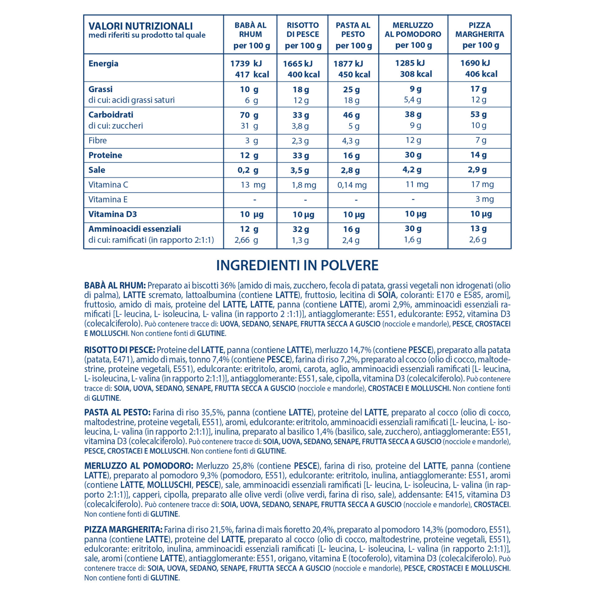 Merluzzo 25,8% (contiene PESCE), farina di riso, proteine del LATTE, panna (contiene LATTE), alimento a base di pomodoro 9,3% (pomodoro, E551), edulcorante: eritritolo, inulina, antiagglomerante: E551, aromi (contiene LATTE, MOLLUSCHI, PESCE), sale, amminoacidi essenziali ramificati [L-leucina, L- isoleucina, L- valina (in rapporto 2:1:1)], capperi, cipolla, alimento a base di olive verdi (olive verdi, farina di riso, sale), addensante: E415, vitamina D3 (colecalciferolo).